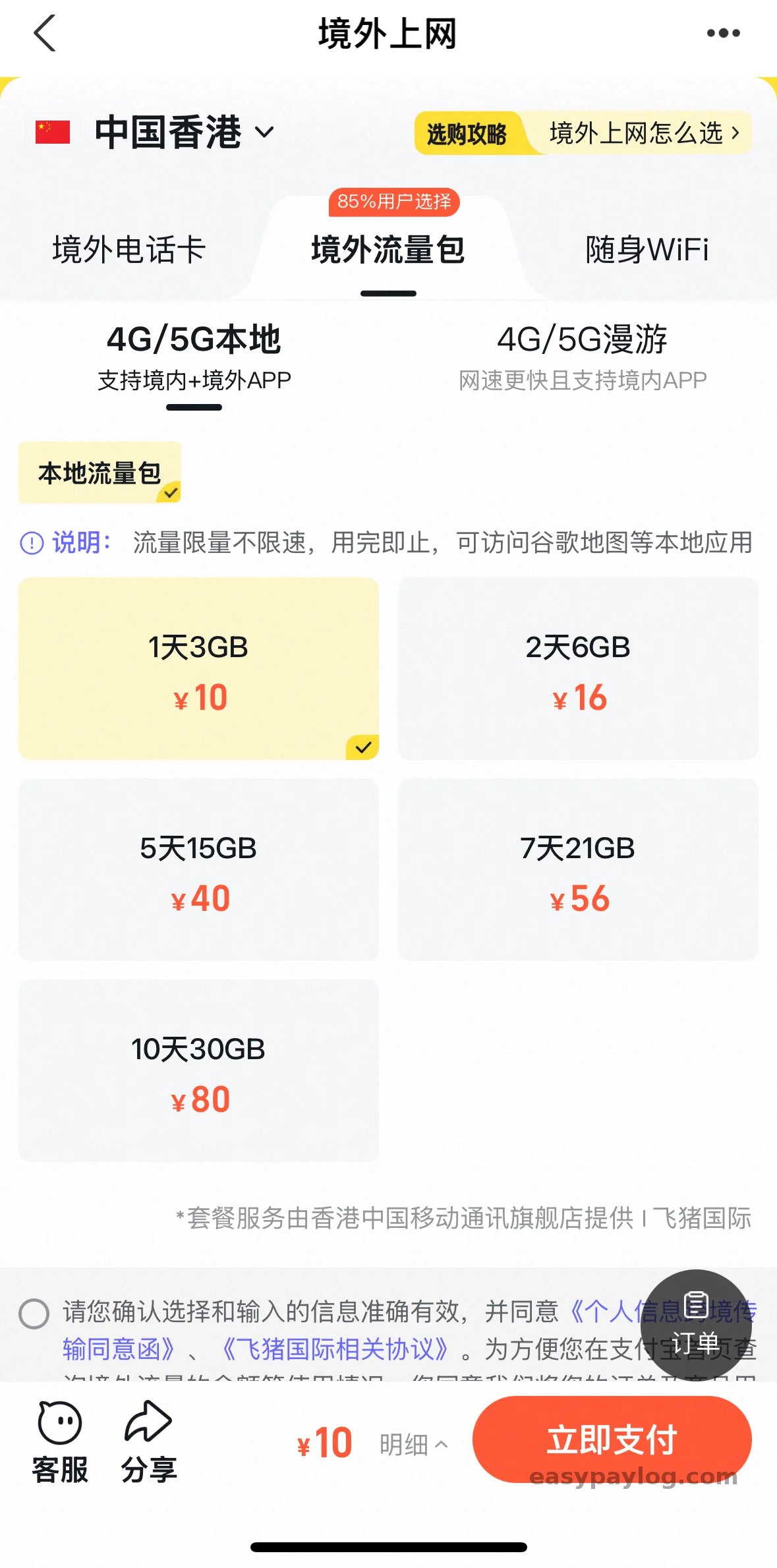 - 注意 :只有过了关,手机连上香港信号后,流量包才会自动激活。
