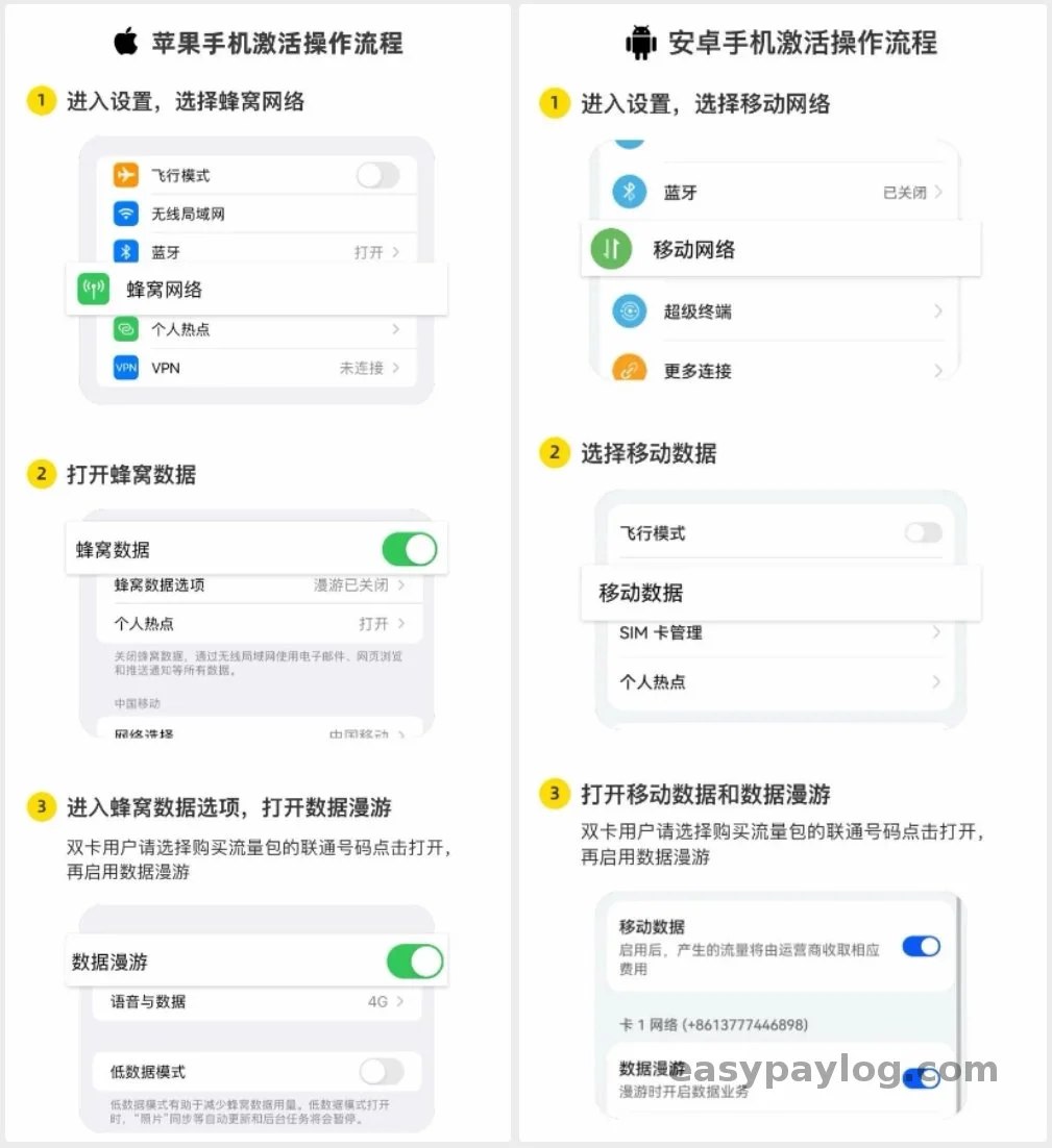 - 开启手机的数据漫游 :很多人购买了流量包发现也无法访问,是你的手机没有开通数据漫游服务,只需要把手机里对应的手机卡设置,开启数据漫游就可以接打电话和接受短信和访问网络了。